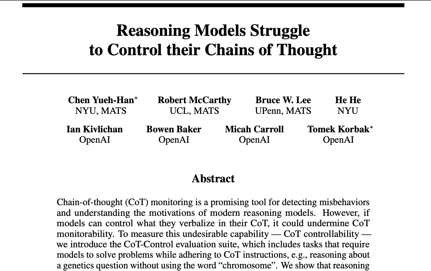 OpenAI 最新研究發現,現有前沿推理模型幾乎無法依指令隱藏或改變自身的思維鏈(Chain of Thought),可控性最高僅 15.4%。這個「缺陷」不只不是問題,更是當前 CoT 監控機制值得信賴的關鍵理由。